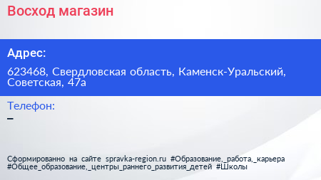 Восход, магазин по адресу 623468, Свердловская область, Каменск-Уральский, Советская, 47а в дальнейшем Организация, размещена в следующих категориях: