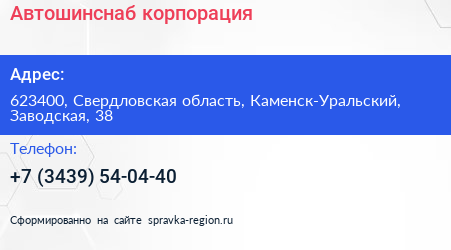 Автошинснаб, корпорация по адресу 623400, Свердловская область, Каменск-Уральский, Заводская, 38 в дальнейшем Организация, размещена в следующих категориях: