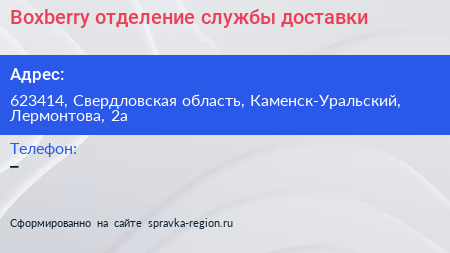 Boxberry, отделение службы доставки по адресу 623414, Свердловская область, Каменск-Уральский, Лермонтова, 2а в дальнейшем Организация, размещена в следующих категориях:
