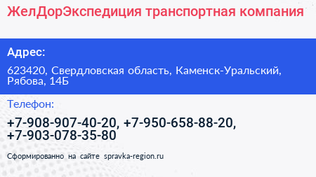 ЖелДорЭкспедиция, транспортная компания по адресу 623420, Свердловская область, Каменск-Уральский, Рябова, 14Б в дальнейшем Организация, размещена в следующих категориях:
