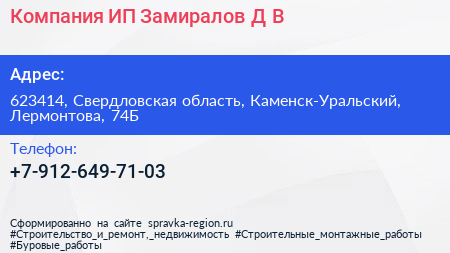 Компания, ИП Замиралов Д.В. по адресу 623414, Свердловская область, Каменск-Уральский, Лермонтова, 74Б в дальнейшем Организация, размещена в следующих категориях: