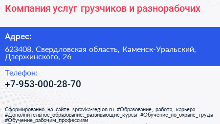 Компания услуг грузчиков и разнорабочих по адресу 623408, Свердловская область, Каменск-Уральский, Дзержинского, 26 в дальнейшем Организация, размещена в следующих категориях: