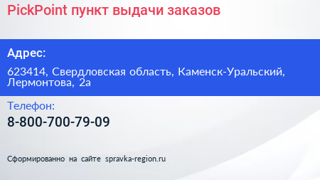 PickPoint, пункт выдачи заказов по адресу 623414, Свердловская область, Каменск-Уральский, Лермонтова, 2а в дальнейшем Организация, размещена в следующих категориях: