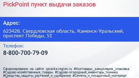 PickPoint, пункт выдачи заказов по адресу 623428, Свердловская область, Каменск-Уральский, проспект Победы, 51 в дальнейшем Организация, размещена в следующих категориях: