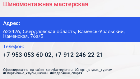 Шиномонтажная мастерская по адресу 623426, Свердловская область, Каменск-Уральский, Каменская, 76а/5 в дальнейшем Организация, размещена в следующих категориях: