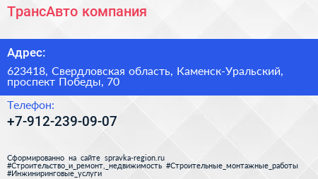 ТрансАвто, компания по адресу 623418, Свердловская область, Каменск-Уральский, проспект Победы, 70 в дальнейшем Организация, размещена в следующих категориях: