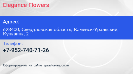 Elegance & Flowers по адресу 623400, Свердловская область, Каменск-Уральский, Кунавина, 2 в дальнейшем Организация, размещена в следующих категориях: