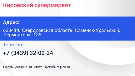 Кировский, супермаркет по адресу 623414, Свердловская область, Каменск-Уральский, Лермонтова, 135 в дальнейшем Организация, размещена в следующих категориях: