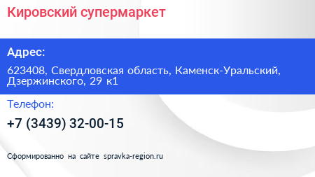 Кировский, супермаркет по адресу 623408, Свердловская область, Каменск-Уральский, Дзержинского, 29 к1 в дальнейшем Организация, размещена в следующих категориях: