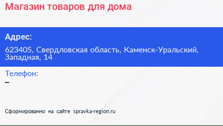 Магазин товаров для дома по адресу 623405, Свердловская область, Каменск-Уральский, Западная, 14 в дальнейшем Организация, размещена в следующих категориях:
