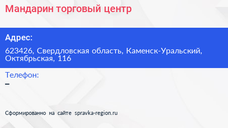 Мандарин, торговый центр по адресу 623426, Свердловская область, Каменск-Уральский, Октябрьская, 116 в дальнейшем Организация, размещена в следующих категориях: