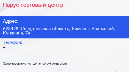 Парус, торговый центр по адресу 623428, Свердловская область, Каменск-Уральский, Кунавина, 7а в дальнейшем Организация, размещена в следующих категориях: