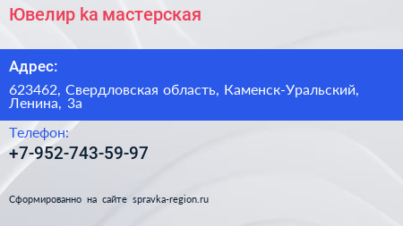 Ювелир & ka, мастерская по адресу 623462, Свердловская область, Каменск-Уральский, Ленина, 3а в дальнейшем Организация, размещена в следующих категориях: