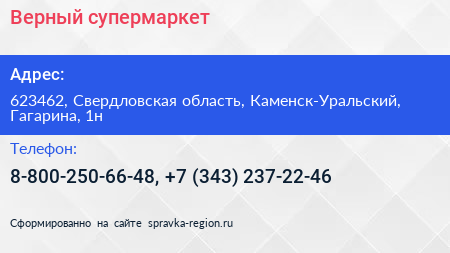 Верный, супермаркет по адресу 623462, Свердловская область, Каменск-Уральский, Гагарина, 1н в дальнейшем Организация, размещена в следующих категориях: