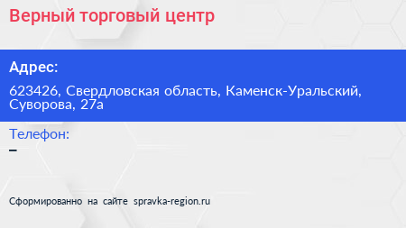 Верный, торговый центр по адресу 623426, Свердловская область, Каменск-Уральский, Суворова, 27а в дальнейшем Организация, размещена в следующих категориях: