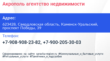 Акрополь, агентство недвижимости по адресу 623428, Свердловская область, Каменск-Уральский, проспект Победы, 39 в дальнейшем Организация, размещена в следующих категориях: