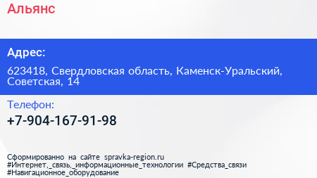 Альянс по адресу 623418, Свердловская область, Каменск-Уральский, Советская, 14 в дальнейшем Организация, размещена в следующих категориях: