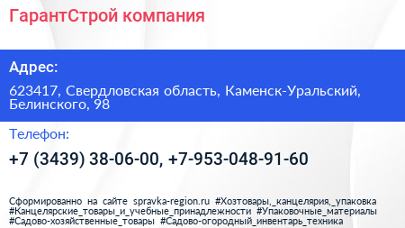 ГарантСтрой, компания по адресу 623417, Свердловская область, Каменск-Уральский, Белинского, 98 в дальнейшем Организация, размещена в следующих категориях: