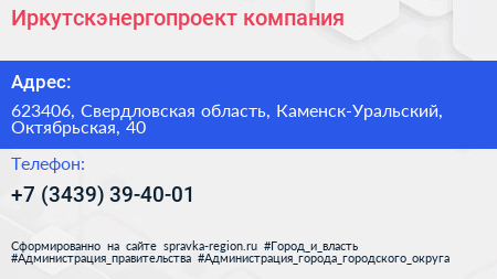 Иркутскэнергопроект, компания по адресу 623406, Свердловская область, Каменск-Уральский, Октябрьская, 40 в дальнейшем Организация, размещена в следующих категориях: