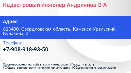 Кадастровый инженер Андриянов В.А. по адресу 623400, Свердловская область, Каменск-Уральский, Кунавина, 2 в дальнейшем Организация, размещена в следующих категориях:
