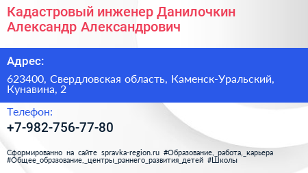 Кадастровый инженер Данилочкин Александр Александрович по адресу 623400, Свердловская область, Каменск-Уральский, Кунавина, 2 в дальнейшем Организация, размещена в следующих категориях: