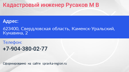 Кадастровый инженер Русаков М.В. по адресу 623400, Свердловская область, Каменск-Уральский, Кунавина, 2 в дальнейшем Организация, размещена в следующих категориях: