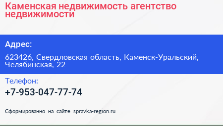 Каменская недвижимость, агентство недвижимости по адресу 623426, Свердловская область, Каменск-Уральский, Челябинская, 22 в дальнейшем Организация, размещена в следующих категориях: