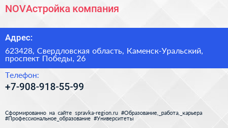 NOVAстройка, компания по адресу 623428, Свердловская область, Каменск-Уральский, проспект Победы, 26 в дальнейшем Организация, размещена в следующих категориях: