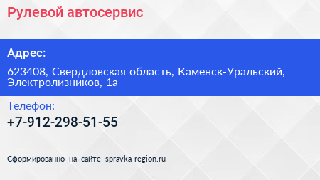 Рулевой, автосервис по адресу 623408, Свердловская область, Каменск-Уральский, Электролизников, 1а в дальнейшем Организация, размещена в следующих категориях: