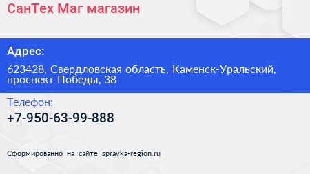 СанТех Маг, магазин по адресу 623428, Свердловская область, Каменск-Уральский, проспект Победы, 38 в дальнейшем Организация, размещена в следующих категориях: