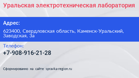 Уральская электротехническая лаборатория по адресу 623400, Свердловская область, Каменск-Уральский, Заводская, 3а в дальнейшем Организация, размещена в следующих категориях: