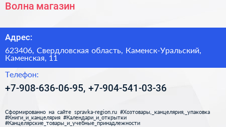 Волна, магазин по адресу 623406, Свердловская область, Каменск-Уральский, Каменская, 11 в дальнейшем Организация, размещена в следующих категориях: