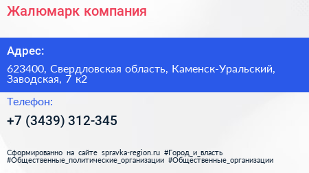Жалюмарк, компания по адресу 623400, Свердловская область, Каменск-Уральский, Заводская, 7 к2 в дальнейшем Организация, размещена в следующих категориях: