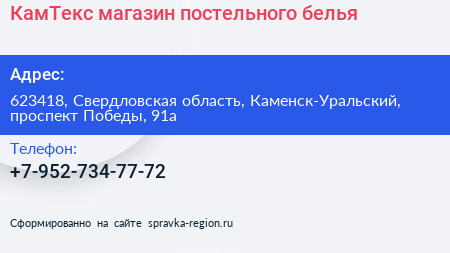 КамТекс, магазин постельного белья по адресу 623418, Свердловская область, Каменск-Уральский, проспект Победы, 91а в дальнейшем Организация, размещена в следующих категориях:
