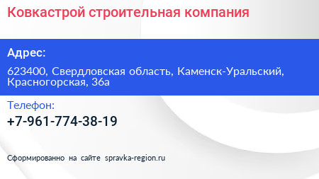 Ковкастрой, строительная компания по адресу 623400, Свердловская область, Каменск-Уральский, Красногорская, 36а в дальнейшем Организация, размещена в следующих категориях: