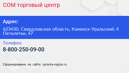 СОМ, торговый центр по адресу 623430, Свердловская область, Каменск-Уральский, 4 Пятилетки, 47 в дальнейшем Организация, размещена в следующих категориях:
