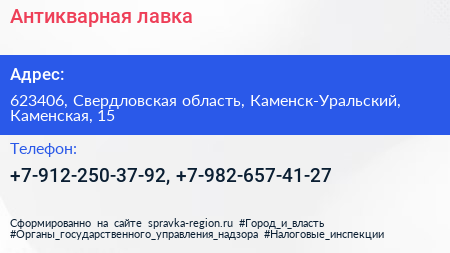 Антикварная лавка по адресу 623406, Свердловская область, Каменск-Уральский, Каменская, 15 в дальнейшем Организация, размещена в следующих категориях:
