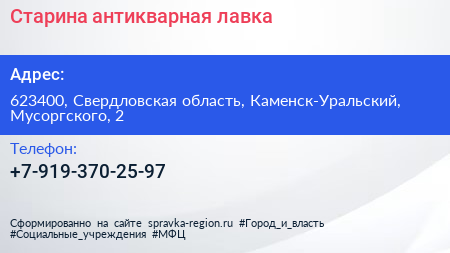 Старина, антикварная лавка по адресу 623400, Свердловская область, Каменск-Уральский, Мусоргского, 2 в дальнейшем Организация, размещена в следующих категориях: