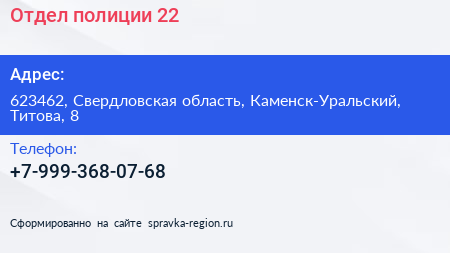 Отдел полиции №22 по адресу 623462, Свердловская область, Каменск-Уральский, Титова, 8 в дальнейшем Организация, размещена в следующих категориях: