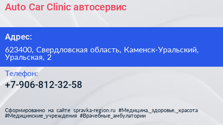 Auto Car Clinic, автосервис по адресу 623400, Свердловская область, Каменск-Уральский, Уральская, 2 в дальнейшем Организация, размещена в следующих категориях: