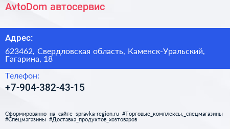 AvtoDom, автосервис по адресу 623462, Свердловская область, Каменск-Уральский, Гагарина, 18 в дальнейшем Организация, размещена в следующих категориях: