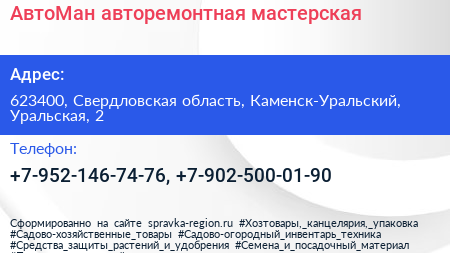 АвтоМан, авторемонтная мастерская по адресу 623400, Свердловская область, Каменск-Уральский, Уральская, 2 в дальнейшем Организация, размещена в следующих категориях: