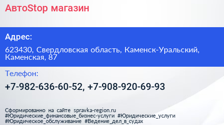 АвтоStop, магазин по адресу 623430, Свердловская область, Каменск-Уральский, Каменская, 87 в дальнейшем Организация, размещена в следующих категориях: