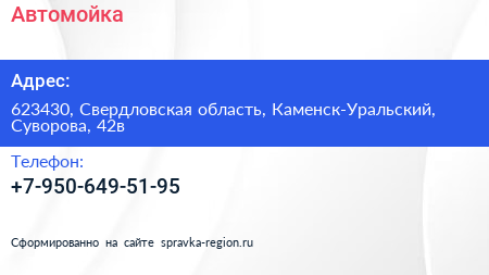 Автомойка по адресу 623430, Свердловская область, Каменск-Уральский, Суворова, 42в в дальнейшем Организация, размещена в следующих категориях: