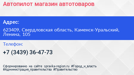 Автопилот, магазин автотоваров по адресу 623409, Свердловская область, Каменск-Уральский, Ленина, 105 в дальнейшем Организация, размещена в следующих категориях:
