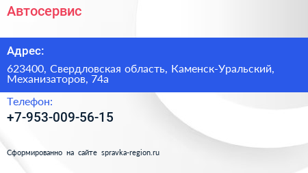 Автосервис по адресу 623400, Свердловская область, Каменск-Уральский, Механизаторов, 74а в дальнейшем Организация, размещена в следующих категориях: