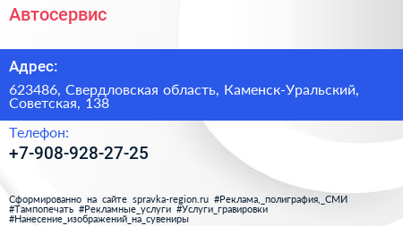 Автосервис по адресу 623486, Свердловская область, Каменск-Уральский, Советская, 138 в дальнейшем Организация, размещена в следующих категориях: