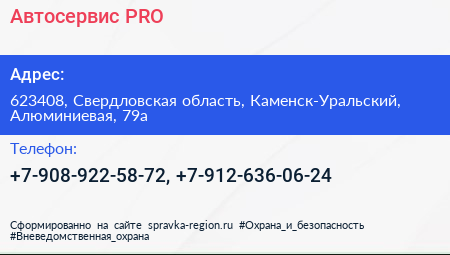 Автосервис PRO по адресу 623408, Свердловская область, Каменск-Уральский, Алюминиевая, 79а в дальнейшем Организация, размещена в следующих категориях: