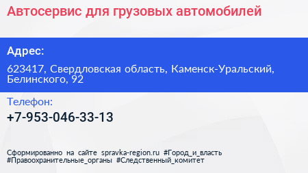 Автосервис для грузовых автомобилей по адресу 623417, Свердловская область, Каменск-Уральский, Белинского, 92 в дальнейшем Организация, размещена в следующих категориях: