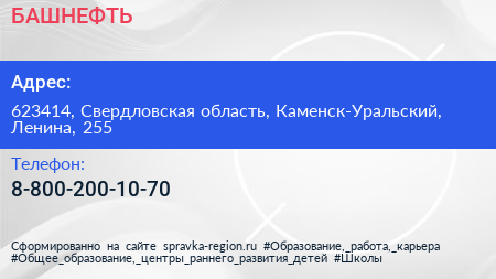 БАШНЕФТЬ по адресу 623414, Свердловская область, Каменск-Уральский, Ленина, 255 в дальнейшем Организация, размещена в следующих категориях: